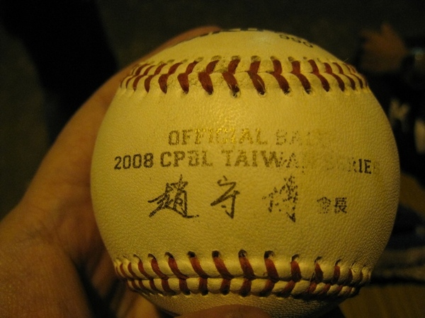 說到昨天所說的爭奪界外球,讓我昨晚翻遍整個相簿才找到當初跟那群撿球的朋友們借來拍照的球,果然最近蠻熱門的趙守博三個字有被打過的痕跡,我能說這還真是巧合嗎?話不多說,寫文章不附圖,此風不可漲阿!圖:金色的字在黃色燈光下看似不起眼,但顏色的確還尚可辨識 圖:蠻特別的金球 圖:趙守博三個字很明顯被打到,這該說....