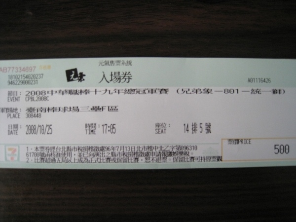 個人今天合理預測,應該是獅隊較佔優勢,但是對於象隊來說,本日賽事比數並不會被拉距太遠,最後的戰力可能是4勝2敗統一獅獲勝今年的系列賽吧,至於詳細的戰力,就等我今日看球回來後再做詳細分析囉,以上附上門票照片,晚點見(閃)